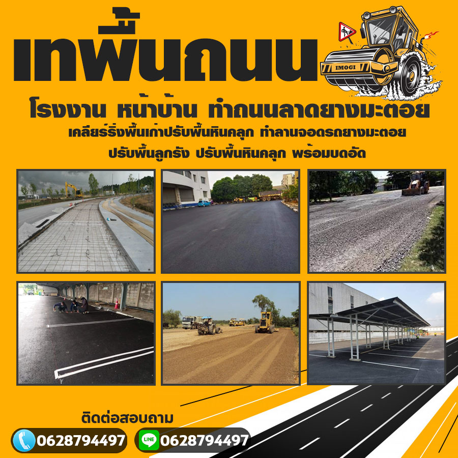 บทำถนนลาดยางมะตอย รับปูยางมะตอย ปรับพื้นหินคลุก พื้นคอนกรีตพิมพ์ลาย ซ่อมถนนลาดยางมะตอย ลาดยางแอสฟัลท์ พื้นลานจอดรถ รับตีเส้นจราจร รถกัดถนนให้เช่า งานเล็กหรืองานใหญ่รับทุกงาน